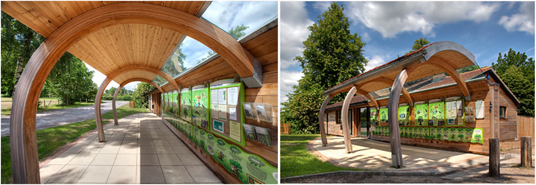 The project features cedar cladding, curved glue laminated timber beams, curved sedum roof, and curved glass roof.
