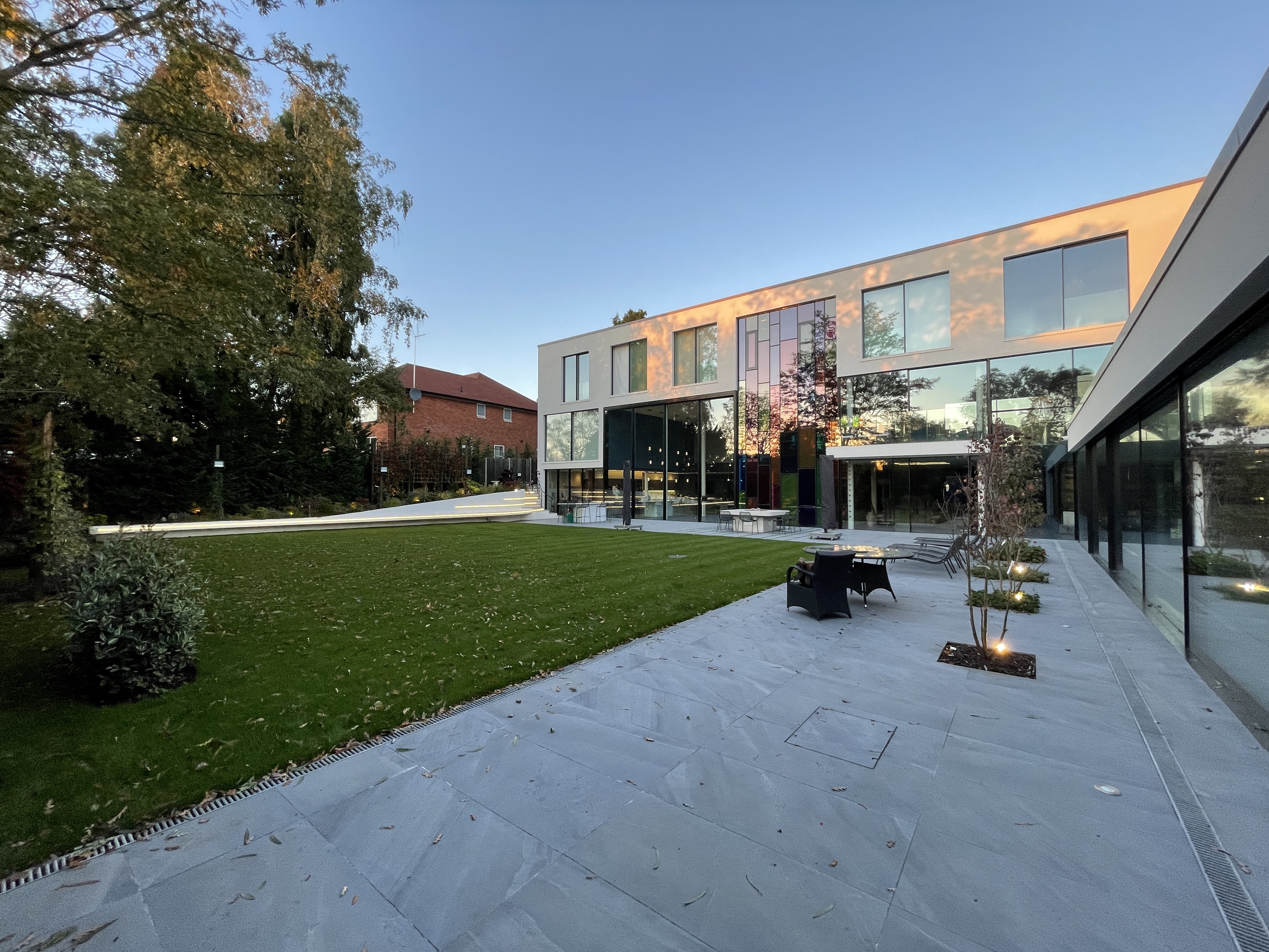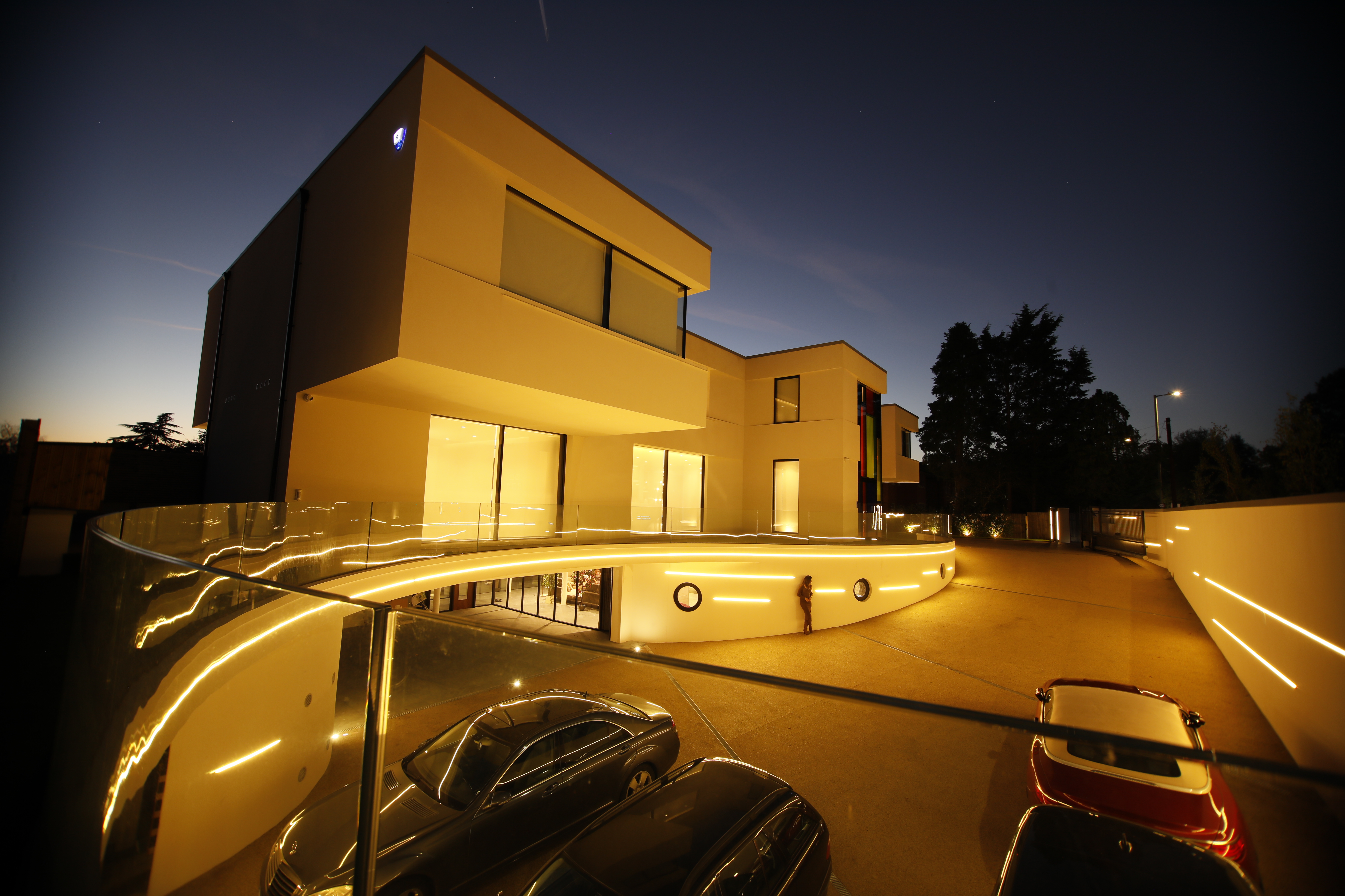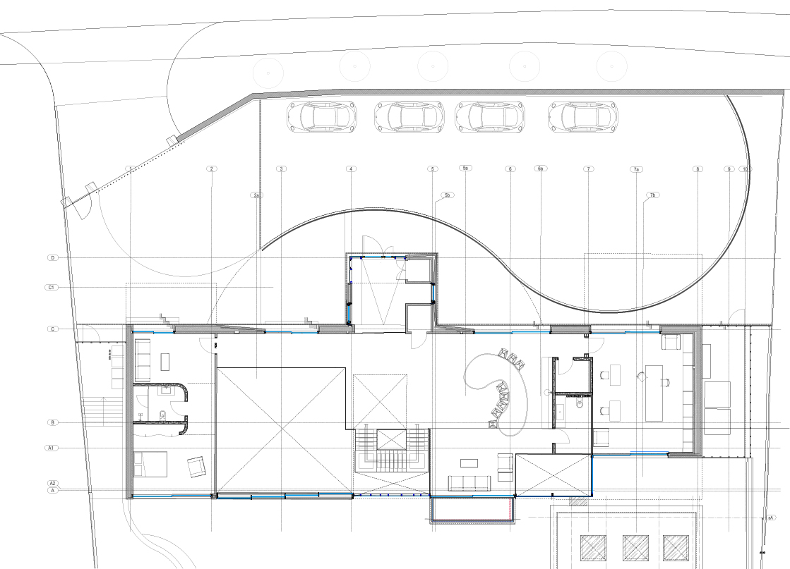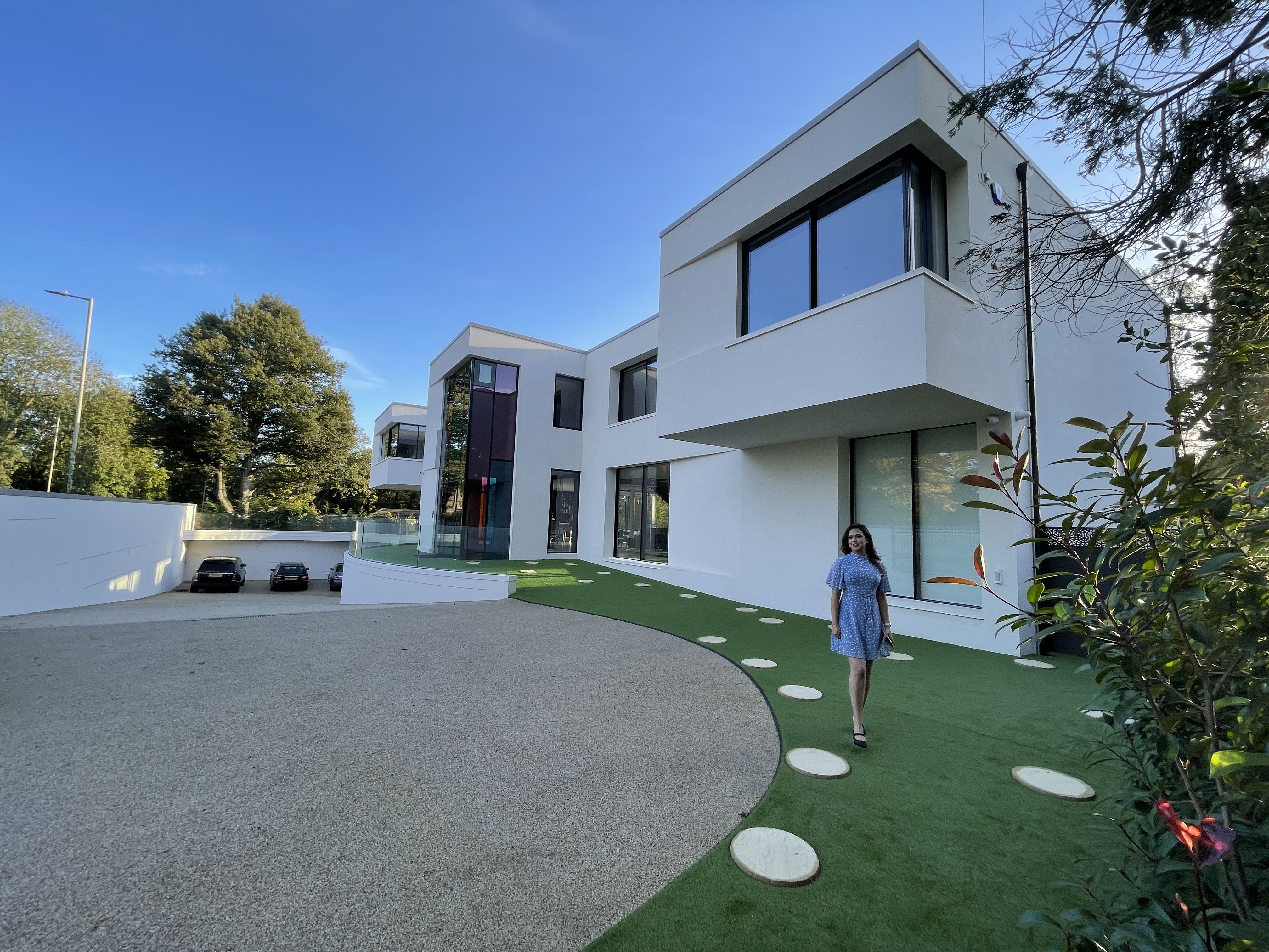 The front driveway and landscape shape is derived from the ancient Hindu symbol 'Aum'.The driveway is wide enough to