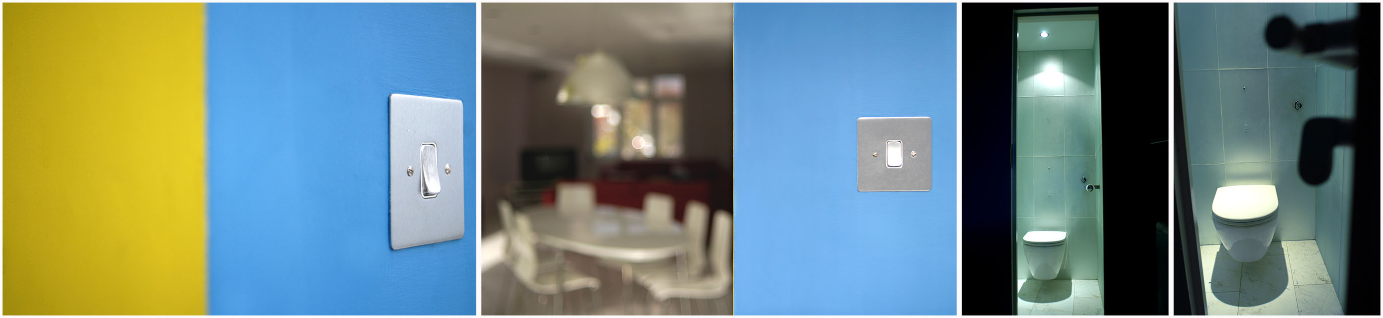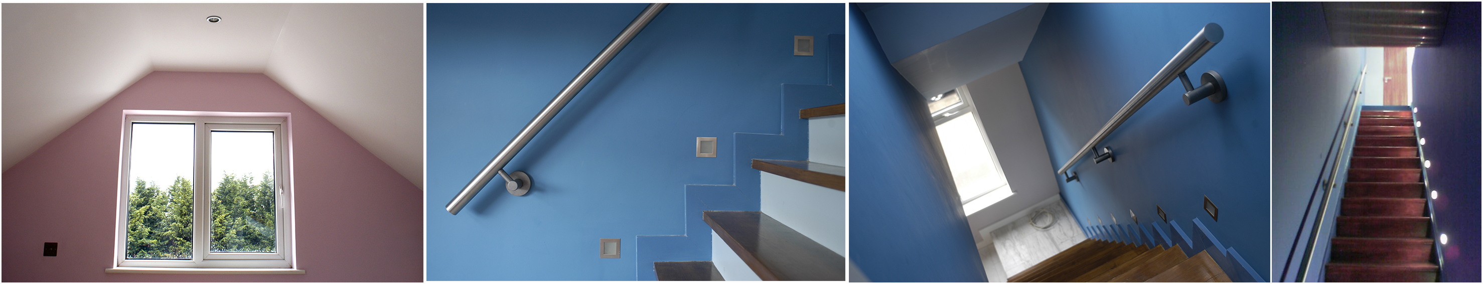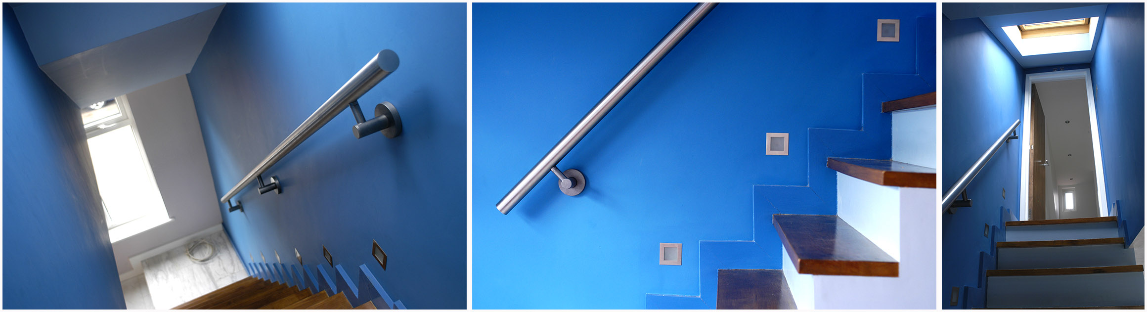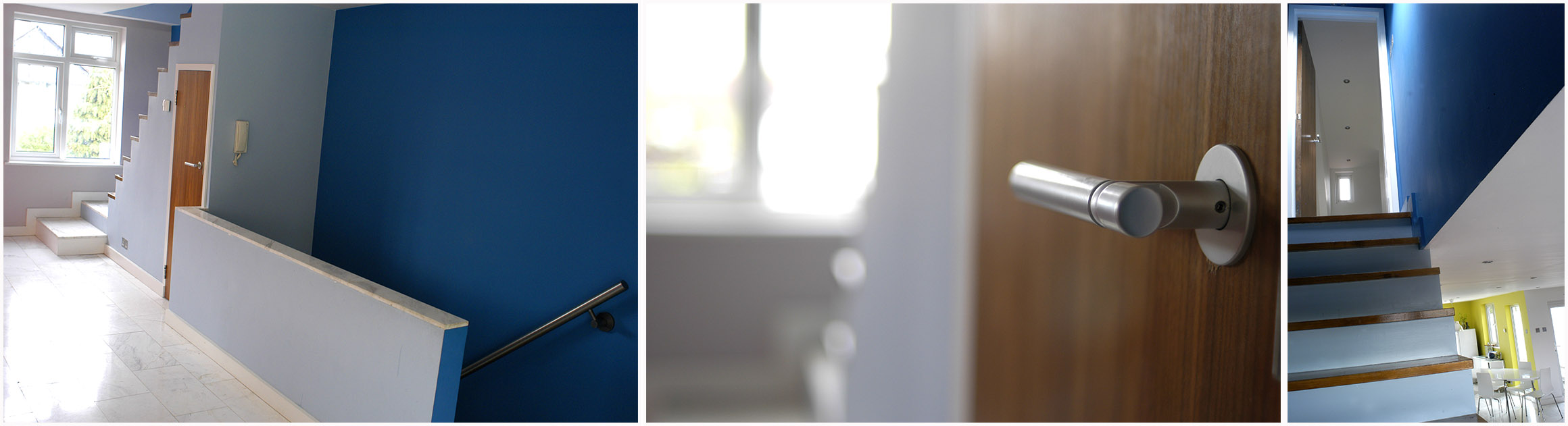 Stainless steel handrails, hardwood stair treads, concealed lighting, walnut veneered doors, brushed aluminum door furniture, and colours.