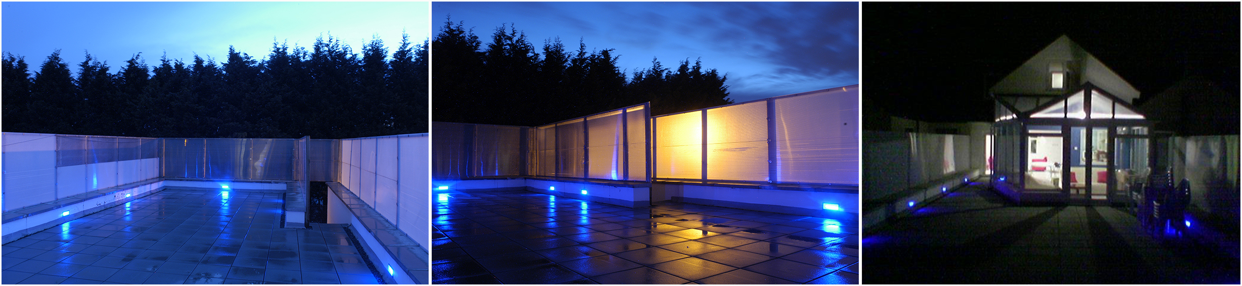Private roof terrace.It has transluscent polycarbonate privacy screens with blue LED parapet lighting.